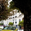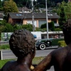 Auf einer Rundfahrt in Luzern. Die Touristen lassen sich vor dem Auto am Schwanenplatz zu akrobatischen Einlagen verleiten und photographieren.